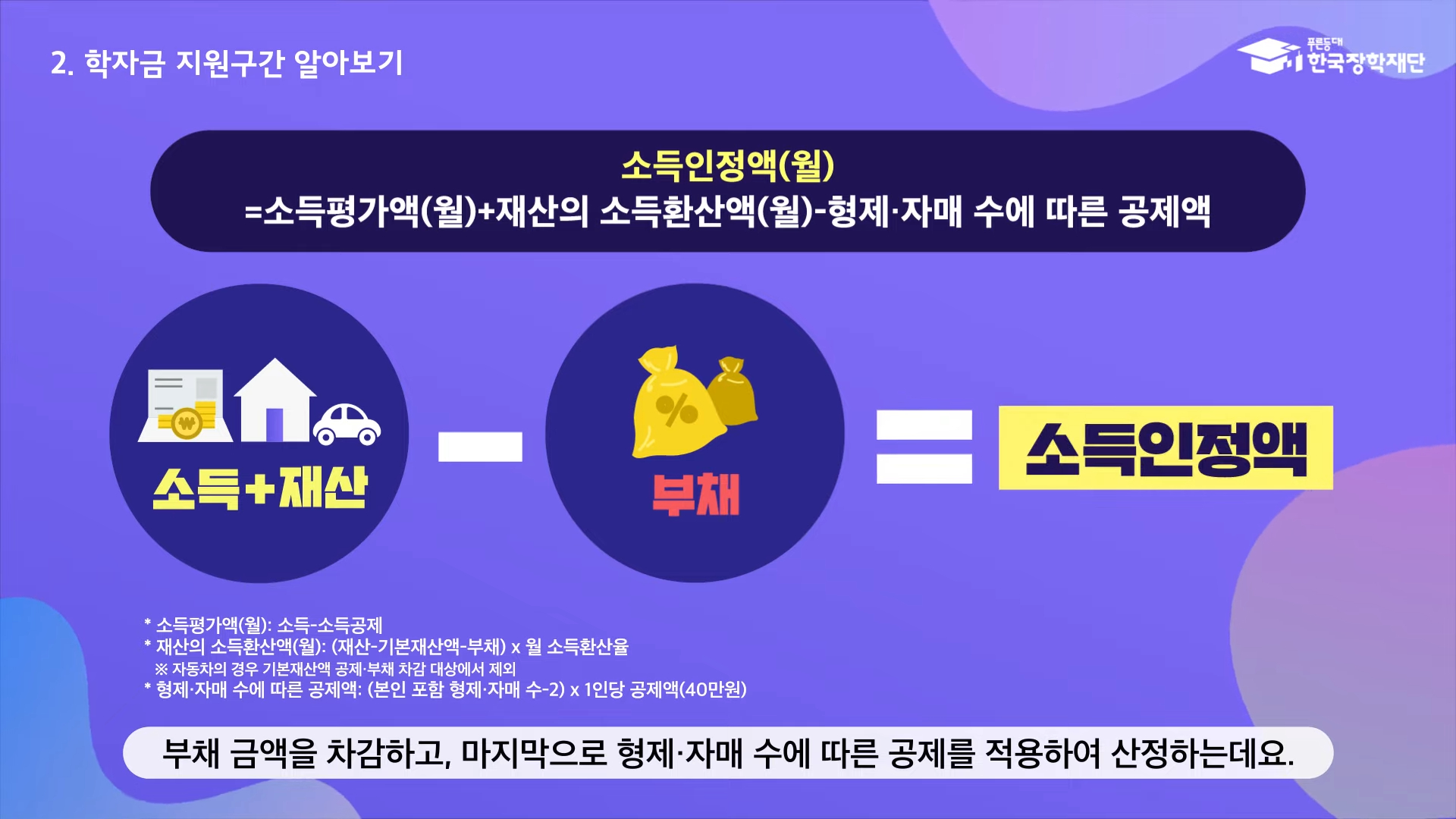 학자금 지원을 신청한 대학생 본인과 가족인 가구의 소득과 재산을 조사하여 대상자를 선정하는 기준이 됩니다. 소득 평가액과 재산의 소득 환산액을 합한 소득인정액에 따라 결정됩니다. 소득인정액은 한국장학재단 홈페이지에서 본인 및 가구원의 개인 신용정보 이용에 동의 후에 사회보장 정보 시스템을 통해 확인할 수 있습니다.