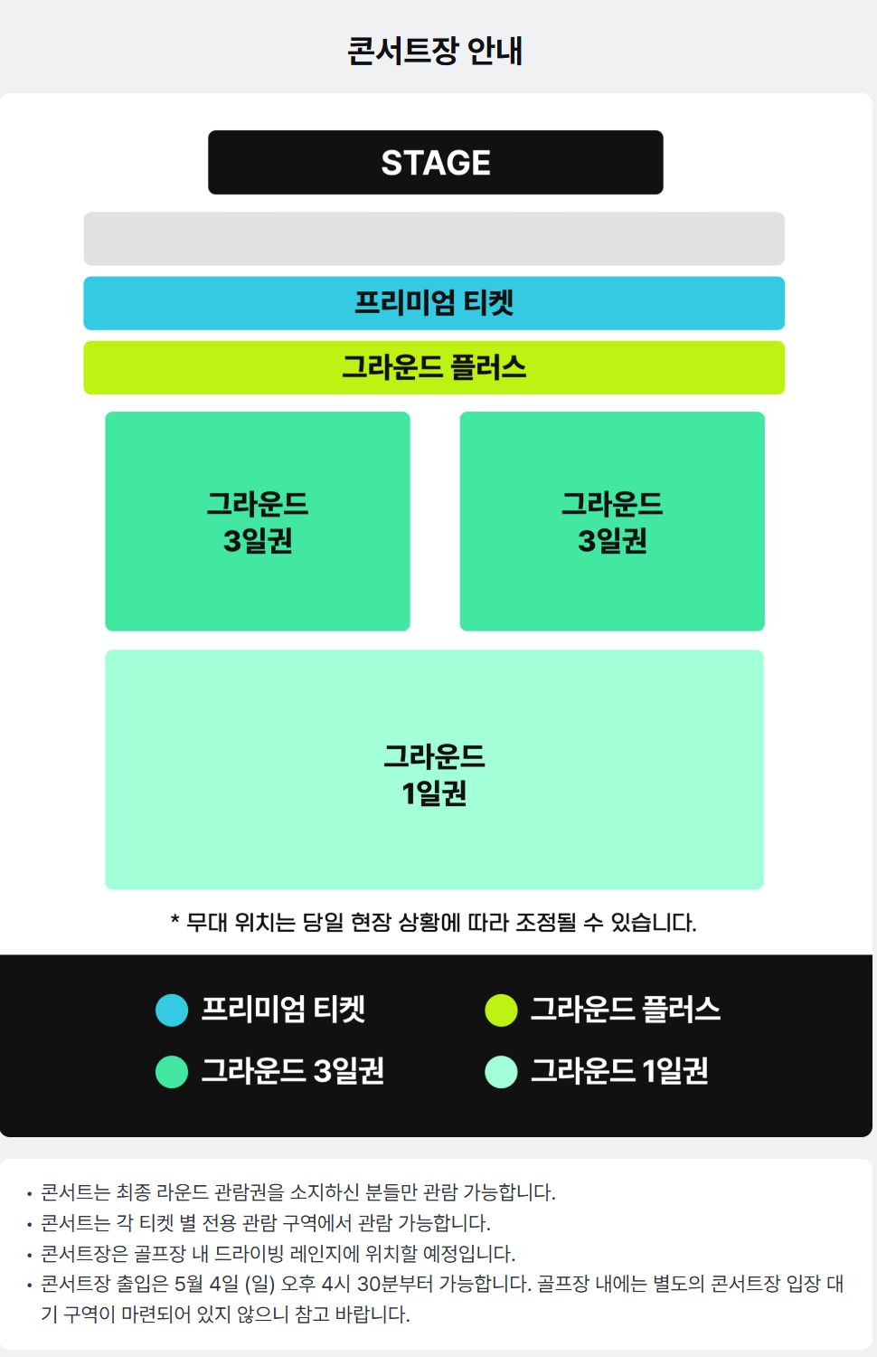 - 공연 시간: 골프 최종 라운드 종료 후 ~ 오후 9시 30분까지